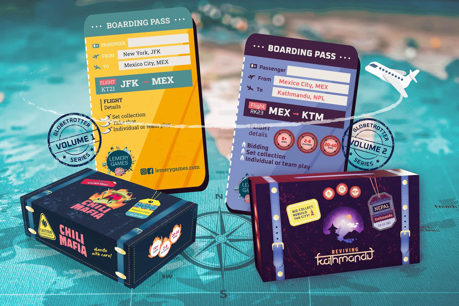 Inspired by our travels, each game in the series takes players to a different country. What we provide for your journey: a suitcase with all components (game box), a passport (rulebook) and a boarding pass (game summary).