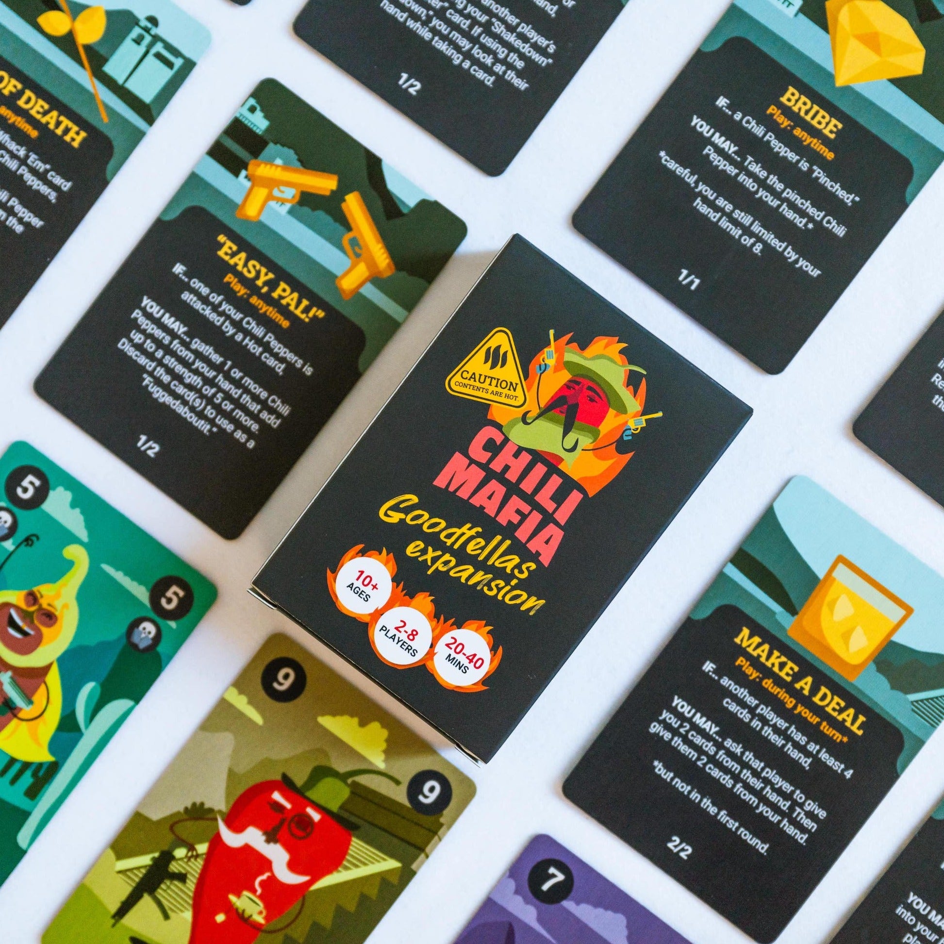 This copy includes everything you need to play the game with 2-8 players plus the Chili Mafia playmat.