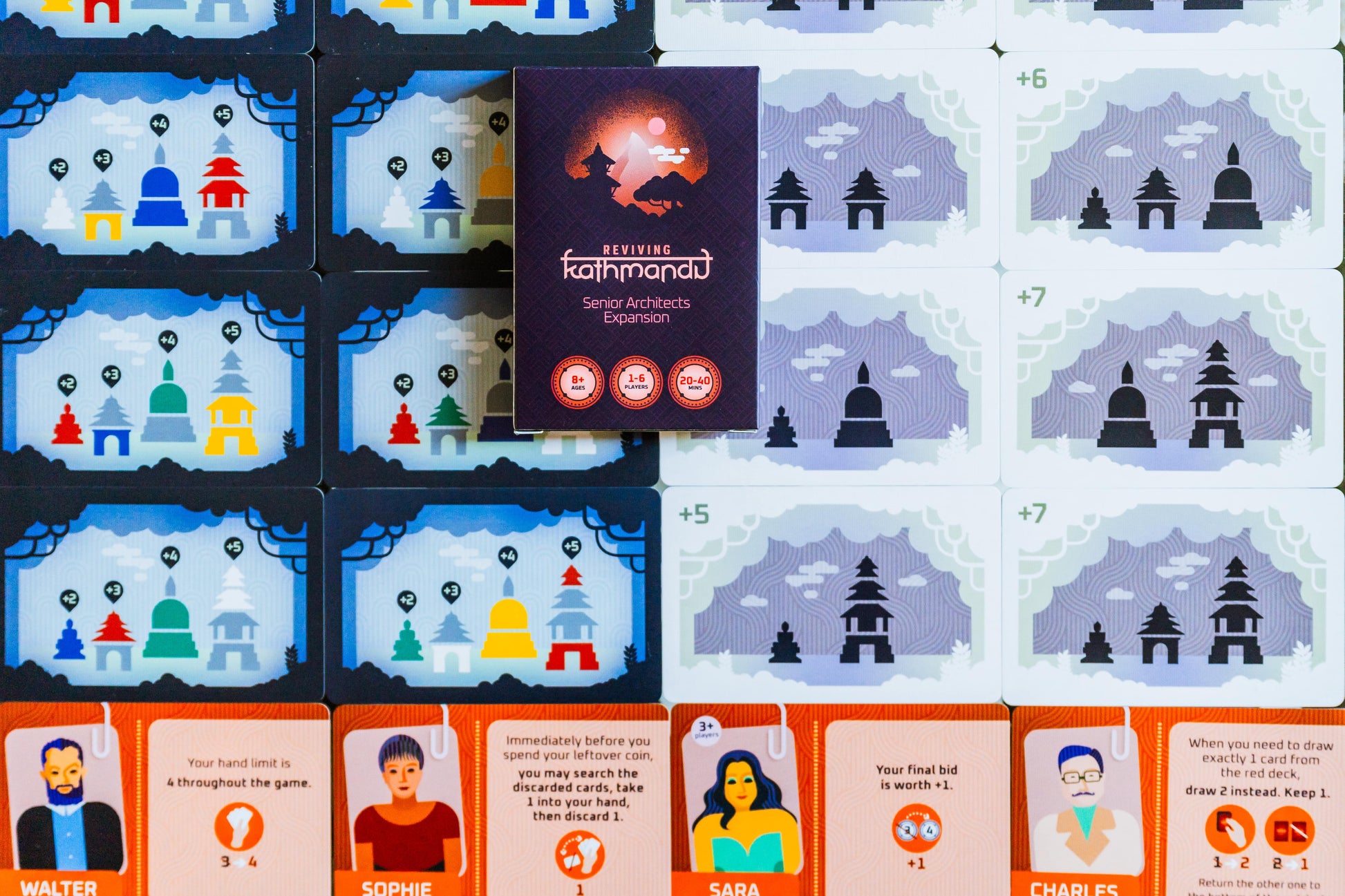 The second game in the Globetrotter Game Series, Reviving Kathmandu is a 1-6 player bidding and set-collection family game. Build pagodas, stupas, statues and shrines, to earn the most points and become the most respected architect in Kathmandu!
